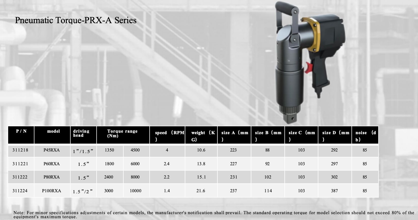 PRX series gun-type pneumatic torque wrench features a standard pneumatic motor and high-precision planetary gearbox, offering lightweight design and excellent cost-performance ratio, making it ideal for applications requiring both high efficiency and superior value.